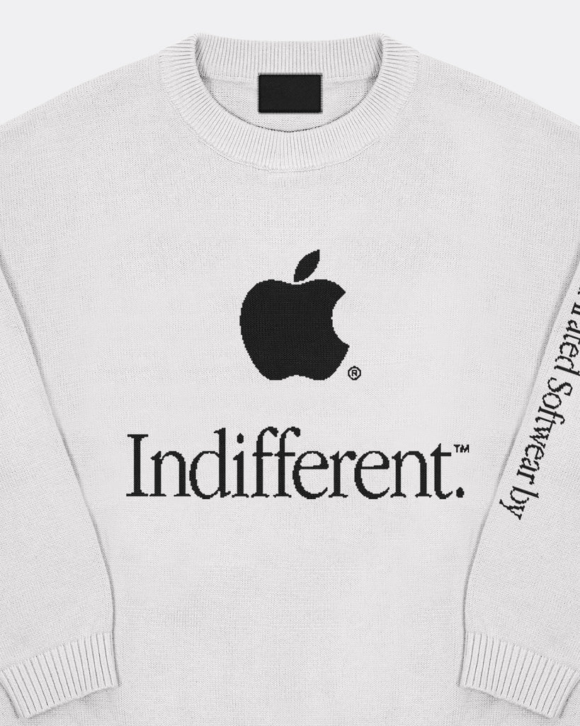Extra soft, lightweight jacquard knit sweater with super famous computer logo and ‘Indifferent’ slogan. You’ll see either a clever pop culture commentary or a mindless cash grab, like that one dress meme. Get it before it’s gone.