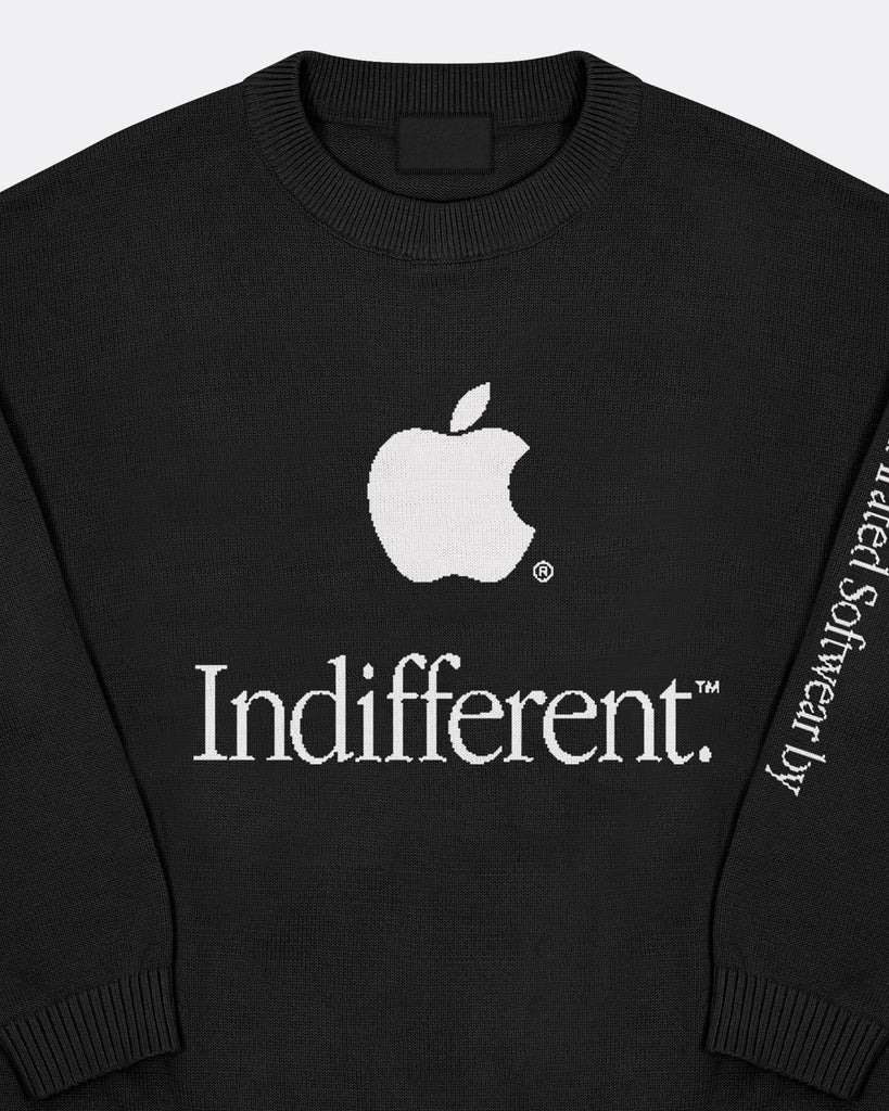 Extra soft, lightweight jacquard knit sweater with super famous computer logo and ‘Indifferent’ slogan. You’ll see either a clever pop culture commentary or a mindless cash grab, like that one dress meme. Get it before it’s gone.